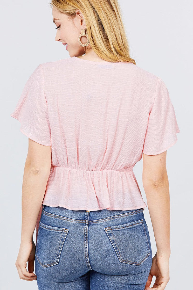 Short Sleeve V-neck Surplice Button Down Detail Ribbon Tie Back Shirring Woven Top