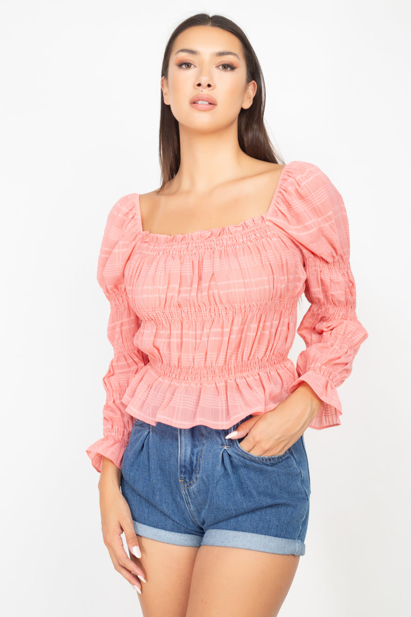 A knit top featuring a plaid pattern, smocking details, a square neckline, peplum hem, long sleeves, and a cropped length.