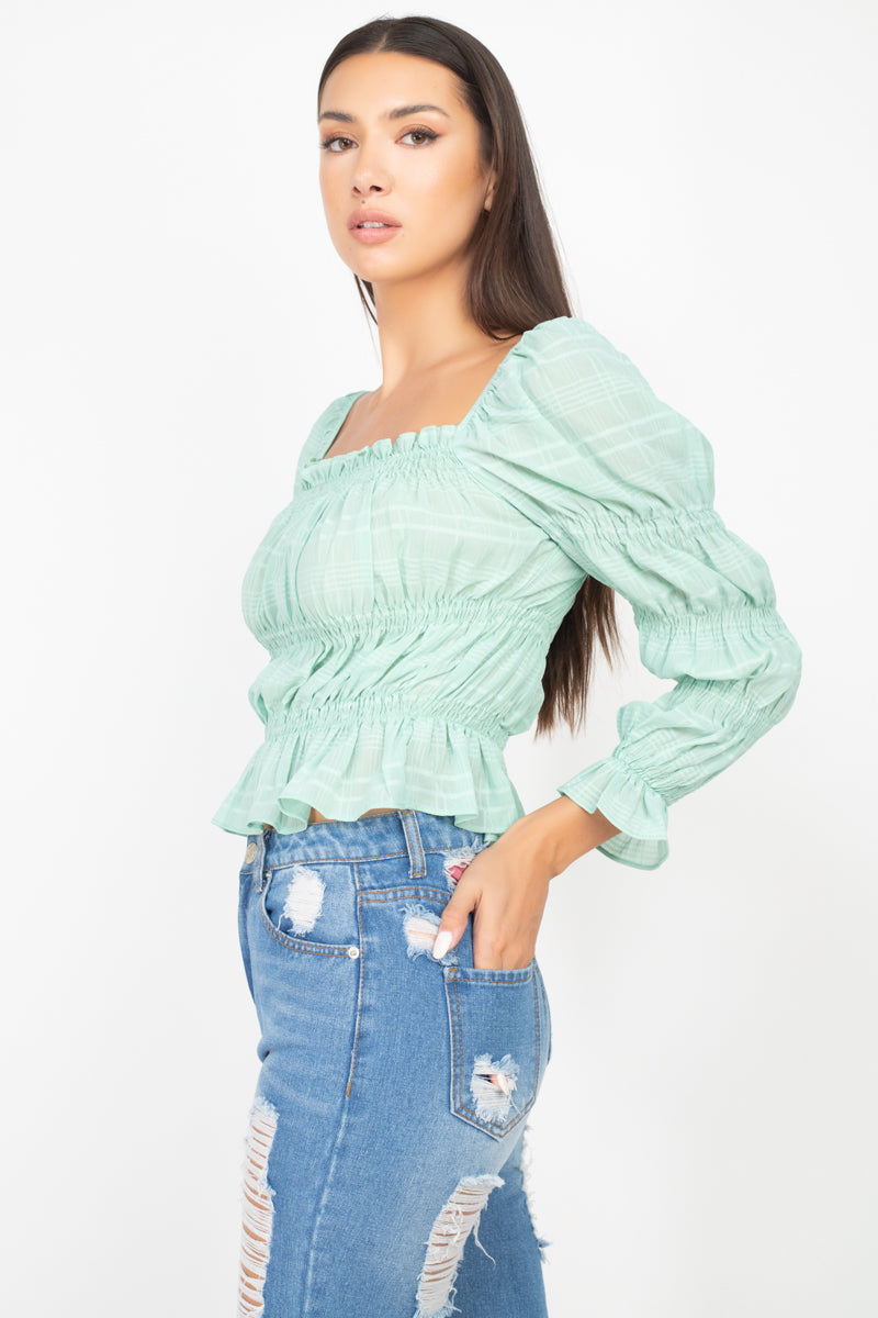 A knit top featuring a plaid pattern, smocking details, a square neckline, peplum hem, long sleeves, and a cropped length.