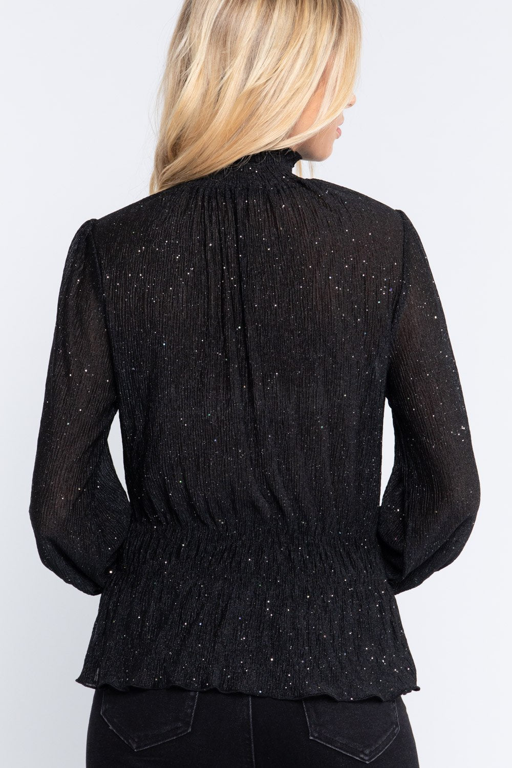 LONG SMOCKED SLEEVE MOCK SPARKLE CRINLKED WOVEN TOP